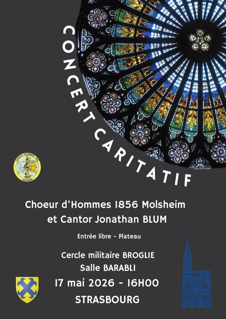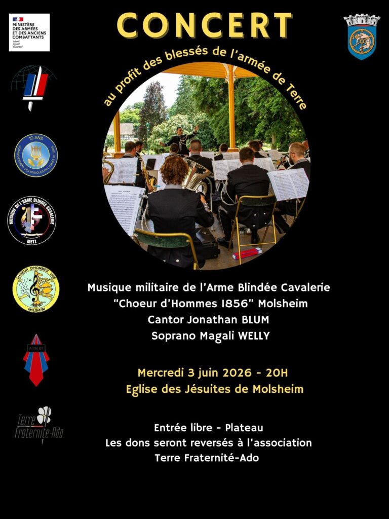 • Mercredi 3 juin 2026 à 20h : Molsheim, Église des Jésuites. Concert caritatif avec la musique militaire de l’Arme Blindée Cavalerie de Metz avec ses 45 musiciennes et musiciens, le Cantor Jonathan BLUM et la Soprano Magali Welly. Entrée libre avec plateau au profit de l’association « Terre Fraternité – Ado ».